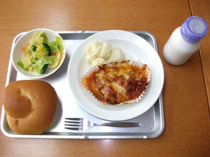 「ミルクパン、鮭のピザ焼き、粉ふき芋、ブロッコリーサラダ、牛乳」です。