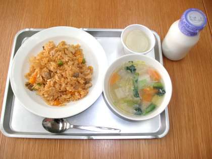 「チキンライス、ベーコンと白菜のスープ、りんごゼリー、牛乳」です。