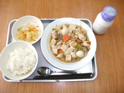 「ごはん、豆腐の五目炒め、辣白菜、牛乳」です。