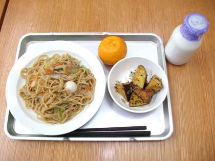 「五目焼きそば、じゃこいり大学芋、ぽんかん、牛乳」です。