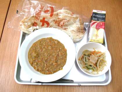 「ナン、キーマカレー、こんにゃくサラダ、りんごジュース」です。