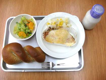 「黒砂糖パン、鮭のガーリック焼き、コーンポテト、フレンチサラダ、牛乳」です。