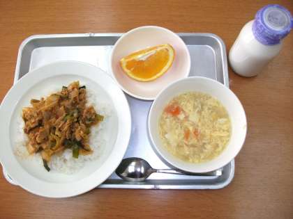 「キムチ丼、卵スープ、ネーブル、牛乳」です。