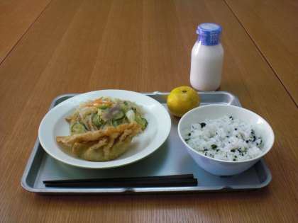 今日の給食は、わかめご飯、牛乳、ジャンボギョーザ、春雨サラダ、くだものです。