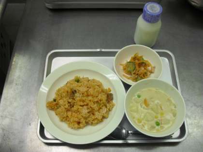 「チキンライス、にんじんサラダ、クリームスープ、牛乳」です。