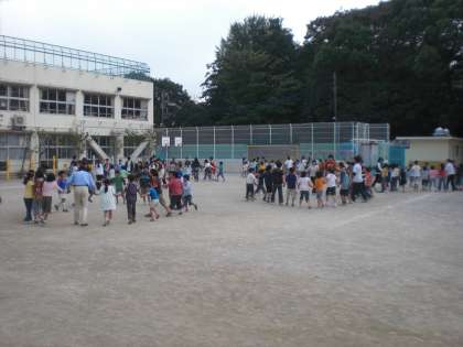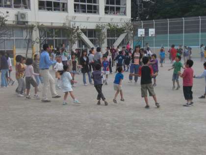 今日は願ってもない好天。来週の全校遠足の晴れを祈って、たてわり班ごとにマイムマイムの曲にのってダンスを繰り広げました。