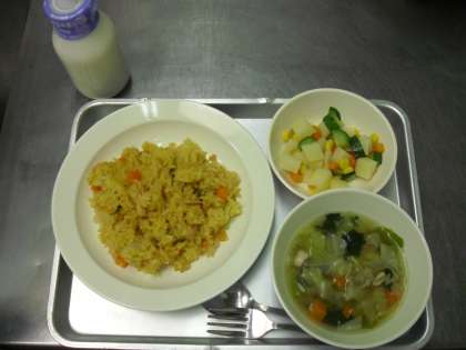 カレーピラフは小さく切った野菜とツナが入ったカレー味のピラフです。とてもおいしくできていました。野菜スープは、給食室で鶏ガラを使ってスープを作っています。よい味でした。マセドアンサラダは角切りにした野菜とじゃがいもやホールコーンが入っておいしかったです。スープもサラダもほとんど残さず食べてくれました。