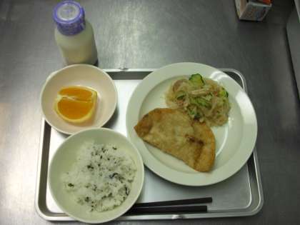 「わかめごはん、ジャンボぎょうざ、春雨サラダ、清見オレンジ、牛乳」です。
