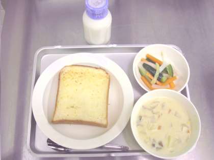 クラムチャウダーはあさりの水煮を使っています。あさりは給食ではあまり出たことがないと思いますが、牛乳を使っておいしく仕上がり、よく食べてくれました。