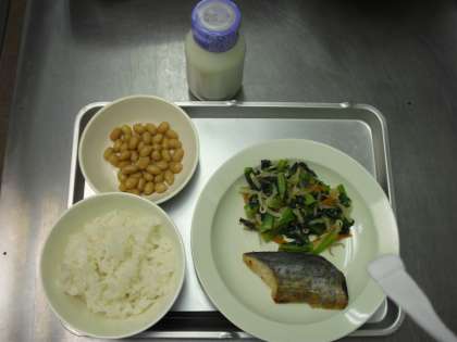 「ごはん、魚の西京焼き、野菜のごまだれかけ、ぶどう豆、牛乳」です。