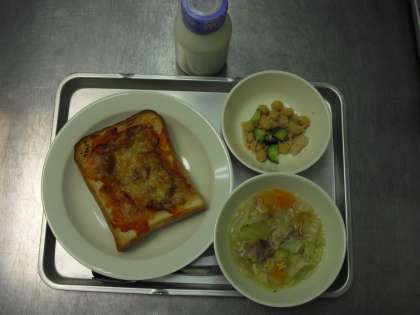 「ピザトースト、ABCスープ、ビーンズサラダ、牛乳」です。