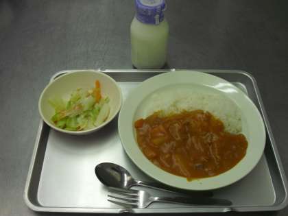 「ハッシュドポークライス、キャベツサラダ、牛乳」です。