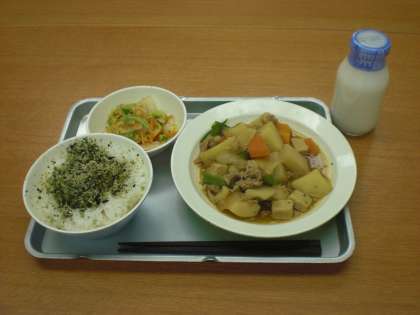 今日の給食は、ごはん・肉じゃがうま煮・白菜のおかか掛け・牛乳です。