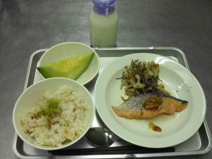 「豆ごはん、魚の南蛮焼き、きざみこんぶの五目煮、メロン、牛乳」です。