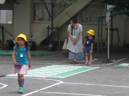 1年生は道路の歩き方、横断の仕方、信号機や一時停止など標識での注意等、ご指導を受けた後に一人ずつ実際に校庭に設置された道路や信号、標識を使い、訓練しました。