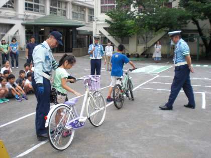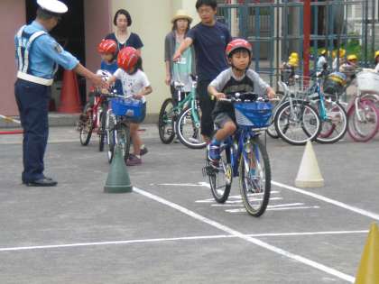 3年生は、自転車の乗り方の指導でした。乗る前の点検の仕方、安全な運転の仕方、止まり方、発車の仕方等、うなづきながら聞き入りました。その後、数人の子供が家から持ってきた自転車を皆で交代に乗って訓練をしました。驚いたことに今年の3年生は全員が自転車に上手に乗っていました。