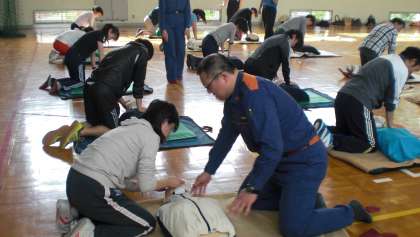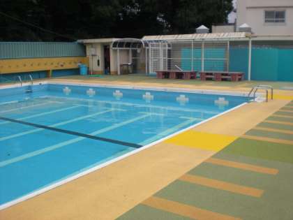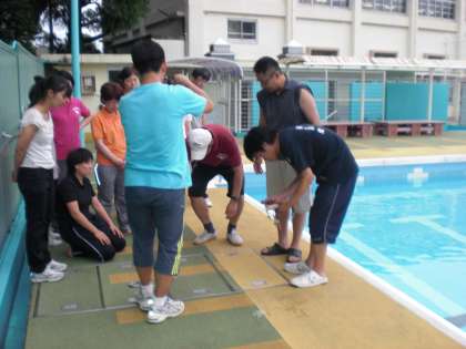 プールもきれいに掃除してもらい、たっぷり水も張りました。プールサイドを補修したり、日よけシートを購入したりしました。また、先月5月13日には、消防署のご指導のもと、同じ学び舎の桜小学校の先生方と一緒に救命救助法講習を受講しました。このように学校の方では準備万端です。