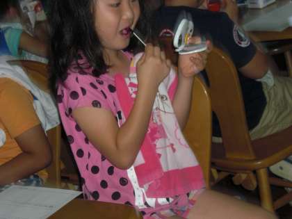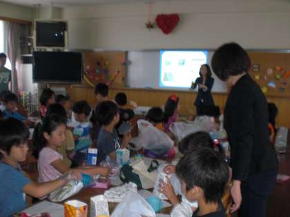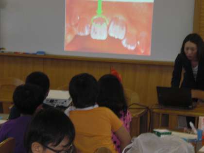 本日は、約1週間前6月4日の「虫歯予防デ—」を受けて、ライオンの指導員に来校していただき、歯磨き指導を行いました。3年生と4年生が対象でした。虫歯のできる原因について、お話を伺った後、実際に自分の歯の染出しを・・・。よく磨いたつもりでも、びっくりするほど歯垢が…。最後に磨き方を丁寧に教えていただきました。食べ終わった後のお皿を洗うのと同じで、すぐに丁寧に隅々まで磨いていきたいものですね。
