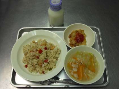 「ナシゴレン、キャベツスープ、大豆とコーンのフリッター、牛乳」です。