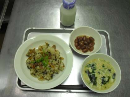 「磯おこわ、かきたま汁、煮豆、牛乳」です。