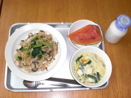 「ビビンバ、にらたまスープ、すいか、牛乳」です。