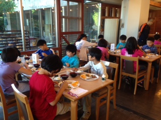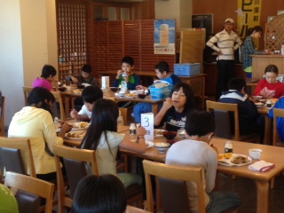 朝食は、根菜入り炒り鳥、もやしと青菜の辛子醤油、ますの切り身焼き、ごはん、ワカメのお吸い物、オレンジ、ヨーグルトドリンクでした。夕飯のカレーが4時半だったせいか、思ったよりみんなよく食べました。