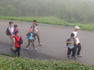 霧の中、予定通りに専門員の案内で村巡りに出発しました。出かける前に、出会いそうな生物とその対処方について教えていただきました。 途中でりんご農家に立ち寄り、冷たい搾りたてのりんごジュースが飲めることを楽しみに元気よく出発しました。