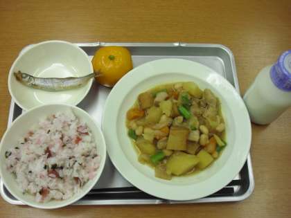 「梅わかごはん、豆入り筑前煮、焼きししゃも、冷凍みかん、牛乳」です。