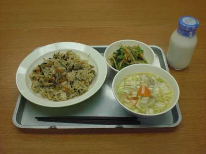 今日の給食は、ひじきご飯・トビウオのつみれ汁・野菜のごまだれかけ・牛乳です。
