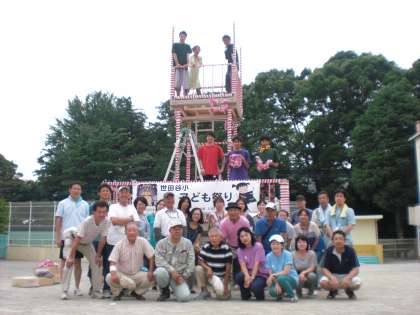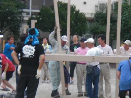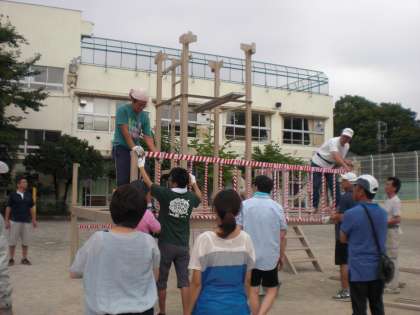 今日は前日と言うことで、遊び場開放委員会の保護者の皆様、地域ネットいぶきの皆さま、BOPの職員、学校教職員、とで盆踊り用のやぐらを組みたてました。前校長も駆けつけて下さいました。しっかりと作り、明日を迎えるまでとなりました。