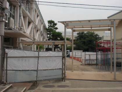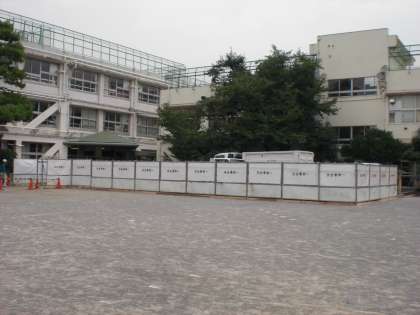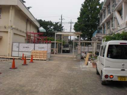 東校舎と西校舎のトイレ改修工事が本格的に始まりました。校庭には簡易な工事壁が張り巡らされてあり校庭が半分程度になりました。また、正門からの大きなトラックの出入りもあります。今日は便器がすべて取り除かれました。