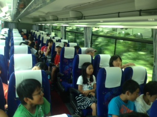 12時45分に江戸時代から現実にタイムスリップし、バスに乗りました。昨夜、一時的に発熱した子もいましたが、今日は全員元気で、予定通り挙行出来ました。今、バスの中では、日光の俳句作りをしている子供、既に作り終わって寝ている子供、CDに合わせて歌っている子供…といろいろです。