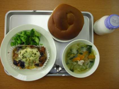 「黒砂糖パン、ムサカ、ゆでブロッコリー、野菜スープ、牛乳」です。