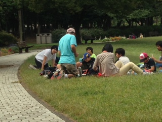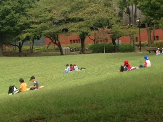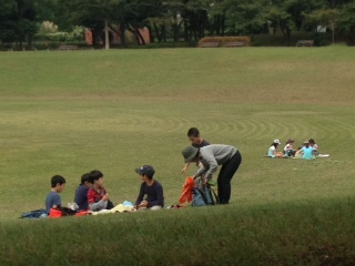 頭を使って買い物をし、集合時間に間に合わせて歩いたりなどで、空腹感が高まり、あっという間にお弁当を平らげました。広い芝生があり、食べ終わるとすぐに元気にからだを動かし始めました。