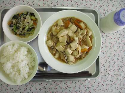 「ごはん、家常豆腐、じゃこサラダ、牛乳」です。