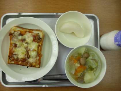 「ピザトースト、ポトフ、なし、牛乳」です。