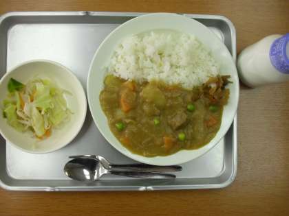 「カレーライス、福神漬、野菜の甘酢かけ、牛乳」です。