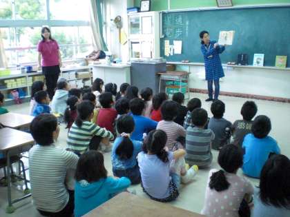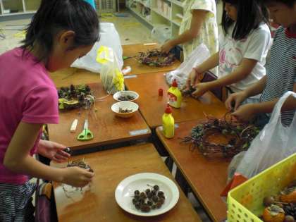今日は、朝学習の時間に読み聞かせがありました。毎月、子供たちは様々な内容のお話を楽しみにしています。また、1年1組は、あさがおのツルを使ってリースを作りました。先日、世田谷八幡宮や城址公園で拾ったどんぐりや松ぼっくりを飾りにつけ、個性的なリースができあがりました。