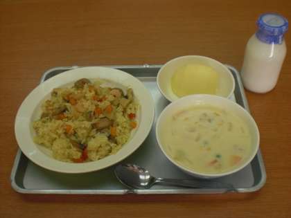 今日の給食は、パエリア・クリームスープ・くだもの・牛乳です。