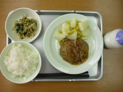「ごはん、むろあじバーグ、おひたし、コーンポテト、牛乳」です。