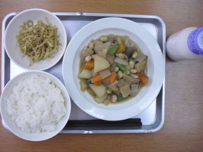「ごはん、豆入り筑前煮、もやしのカレーじょうゆかけ、牛乳」です。