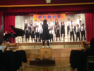 初めに各クラスごとの合唱による合唱コンクール、次にPTAコーラス、意見発表会、英語スピーチ、三味線演奏と続きました。