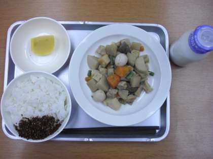 「ごはん、ふりかけ、鶏肉と里芋のうま煮、柿、牛乳」です。