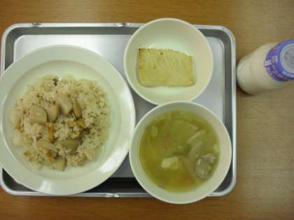 「里芋ごはん、いかの照り焼き、豚汁、牛乳」です。