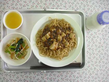 「麻婆豆腐焼きそば、ナムル、みかんゼリー、牛乳」です。