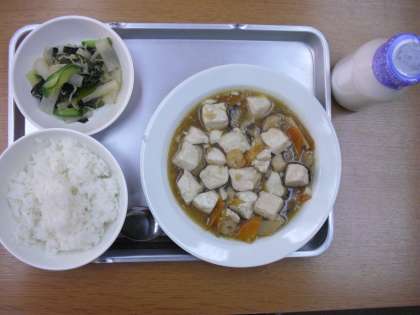 「ごはん、豆腐の五目炒め、じゃこサラダ、牛乳」です。