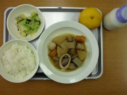 「ごはん、いかと大根のうま煮、キャベツの塩こんぶかけ、みかん、牛乳」です。