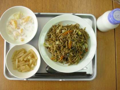 「ソース焼きそば、大根の中華味、フルーツヨーグルト、牛乳」です。