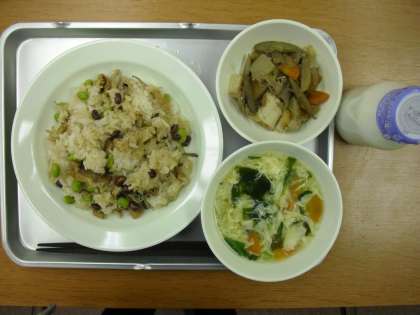 「まめまめおこわ、五目うま煮、かきたま汁、牛乳」です。