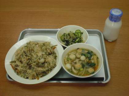 今日の給食は、豚肉とごぼうのごはん・あんかけ汁・じゃこサラダ・牛乳です。